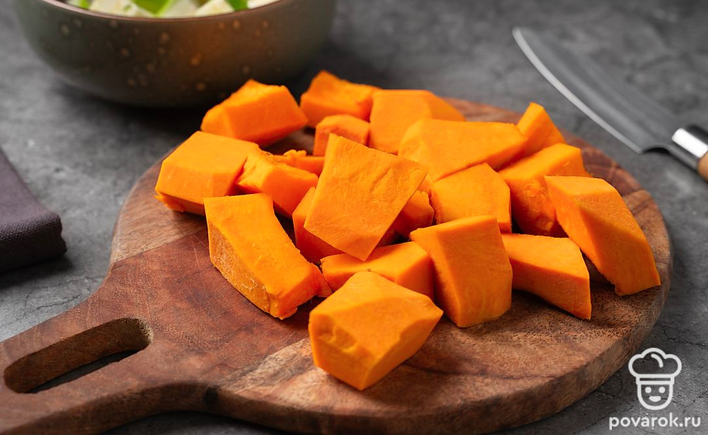 Очистите тыкву и кабачок от кожуры и нарежьте кубиками. Чем меньше будут кубики, тем быстрее овощи приготовятся.