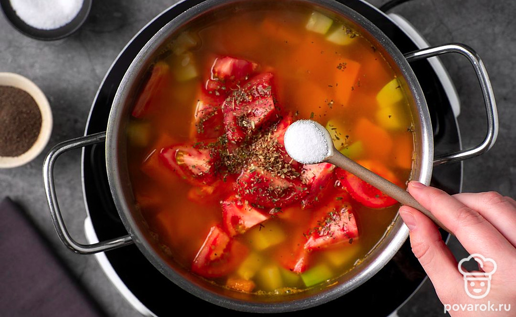 Произвольно нарежьте томаты. Добавьте их в кастрюлю вместе с травами, лавровым листом, солью и перцем. Варите суп на медленном огне еще 5-10 минут, пока тыква не станет мягкой.