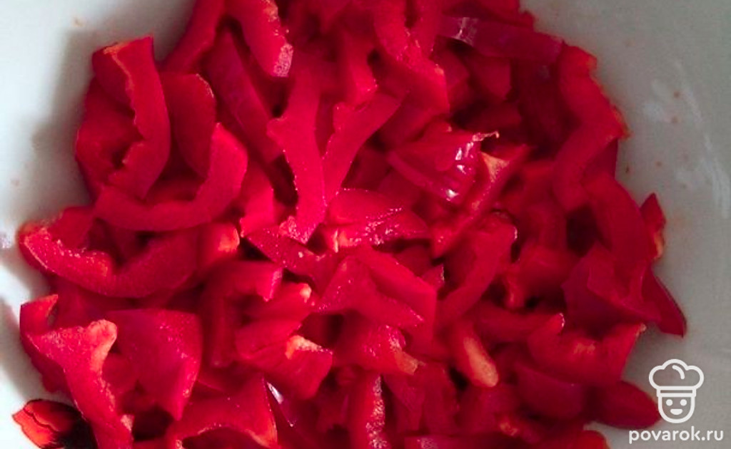 Болгарский перец очистите от семян и хвостиков, нарежьте тонкими полосками.