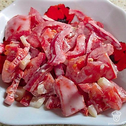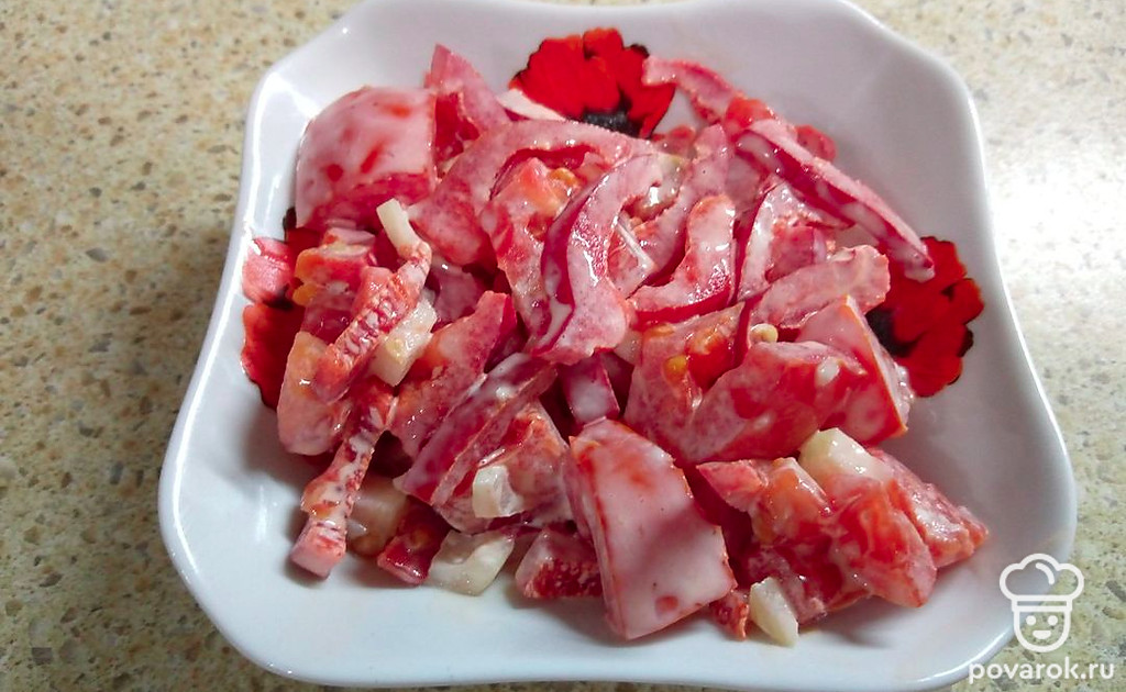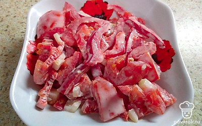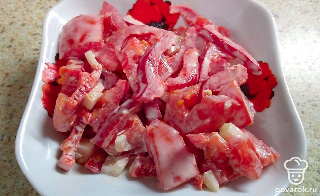 В отдельном блюдце смешайте сметану, майонез и пропущенный через пресс чеснок. Заправьте этим соусом салат. Перемешайте и разложите по порционным тарелкам. Готово!