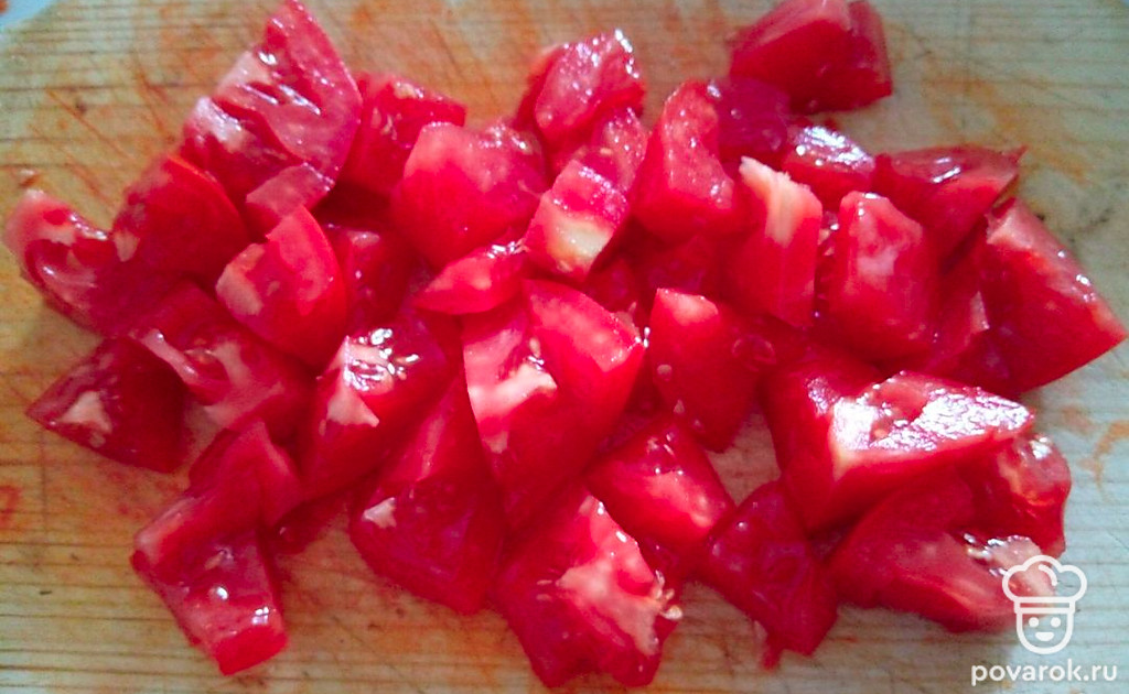 Помидоры помойте и нарежьте кубиками. Соедините с болгарским перцем.