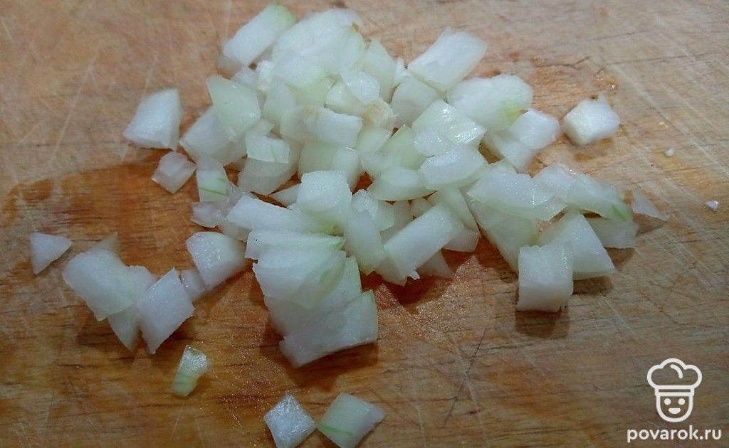 Репчатый лук почистите и нарежьте небольшими кубиками. Соедините с другими овощами и посолите.