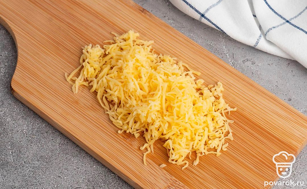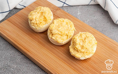 Очистите яйцо и разрежьте пополам. Яичный желток выньте чайной ложкой и мелко покрошите в отдельной тарелке. Натрите сыр на терке.