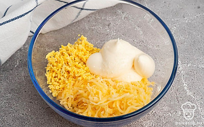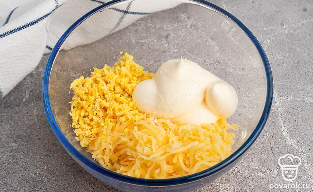 Смешайте вместе в отдельной миске яичный желток, сыр, майонез, соль и перец. Хорошо их перемешайте до густой массы.