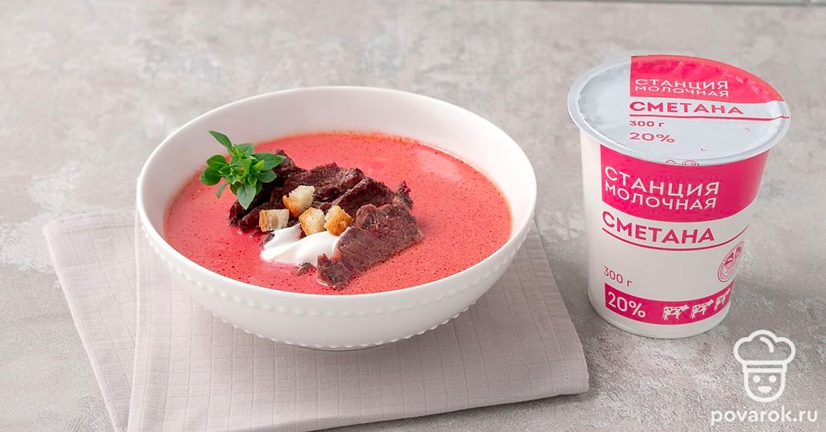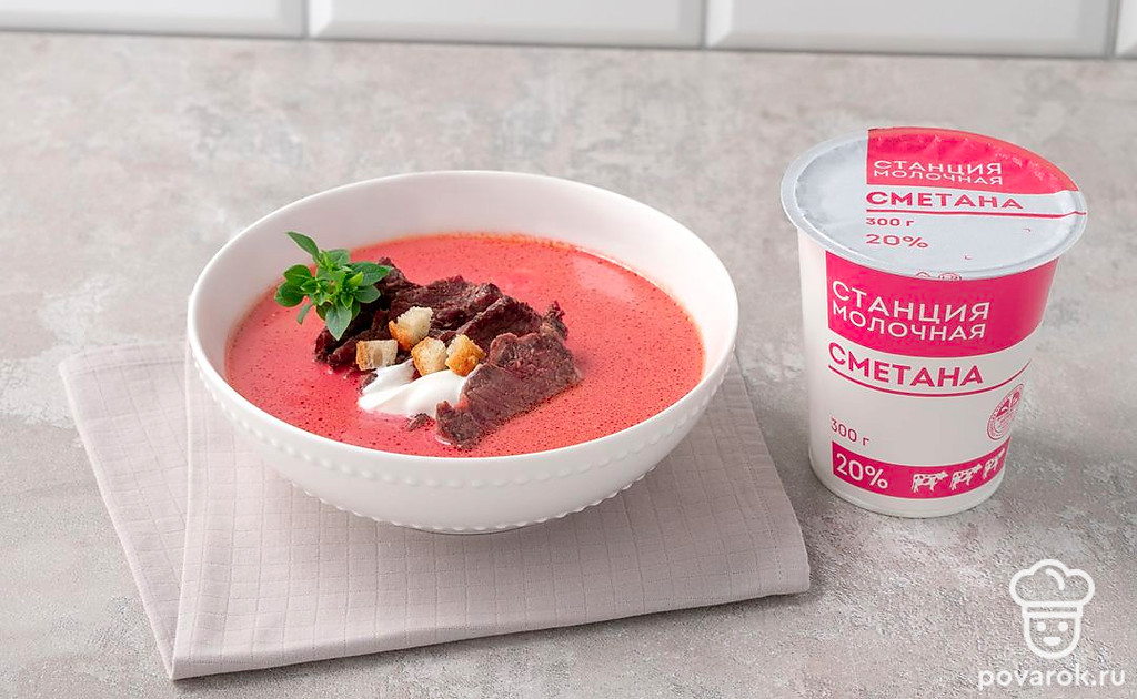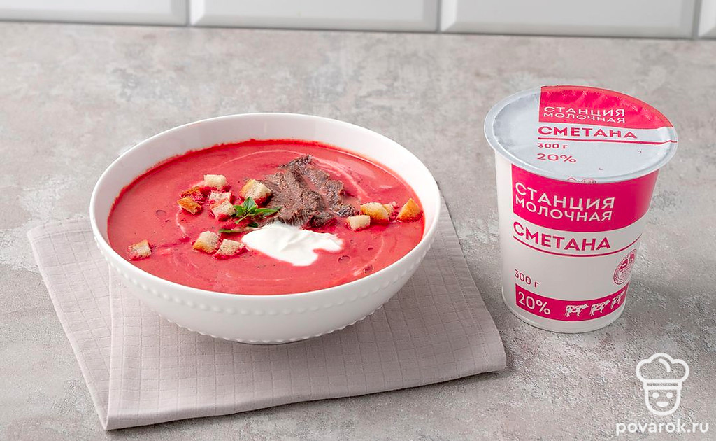 Нарежьте мясо на небольшие кусочки. Положите в тарелку немного борща. Добавьте ложку сметаны, перемешайте. Сверху выложите кусочки говядины.