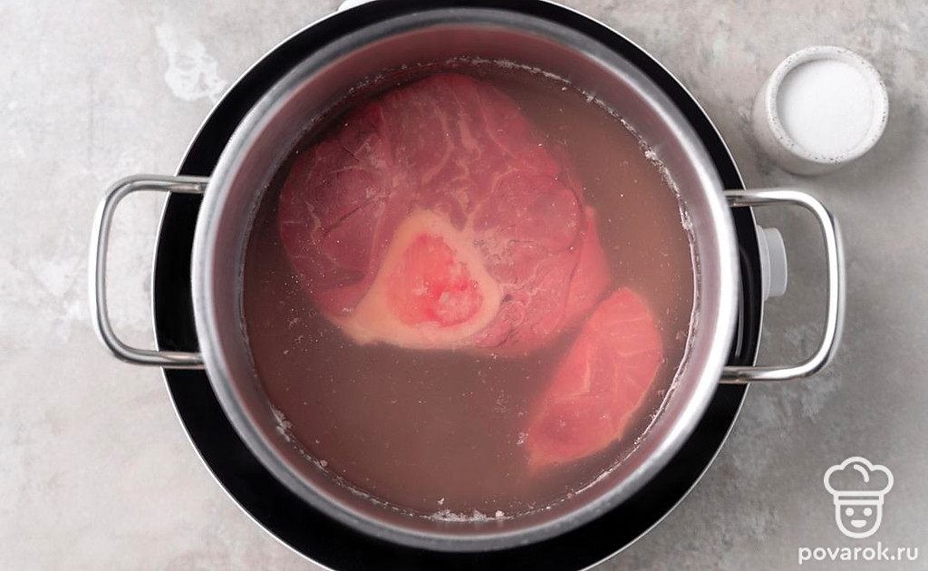 Положите кусок говядины в кастрюлю, залейте водой и поставьте на средний огонь. Доведите до кипения, снимите пену. Посолите, уменьшите нагрев и варите 1 час под крышкой.