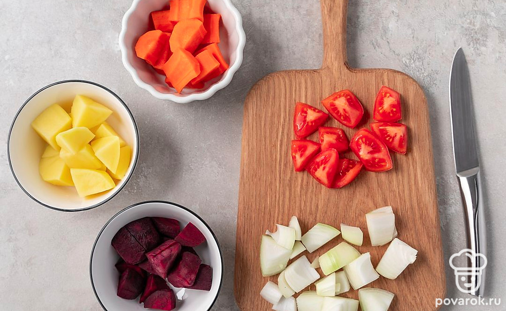 Нарежьте на кубики среднего размера картофель, свеклу, морковь, помидор и лук.