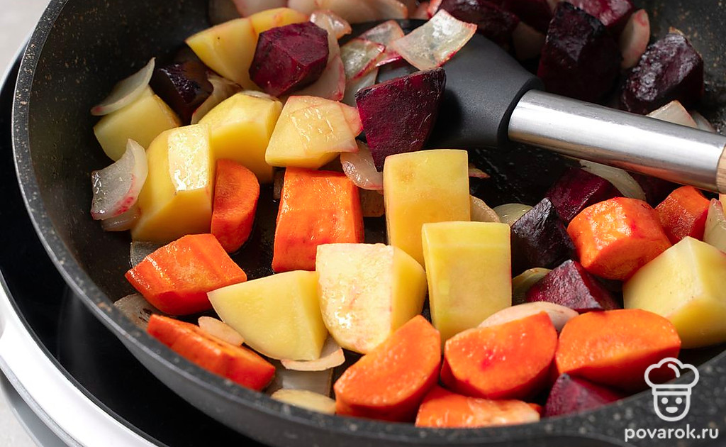 Добавьте на сковороду свеклу и картошку, готовьте еще 15 минут, периодически перемешивая. Положите в сковороду помидор. Тушите овощи еще 10 минут.