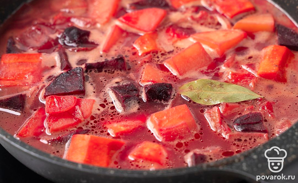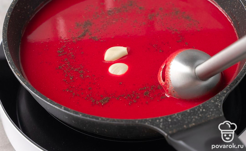 Отключите нагрев. Уберите лавровый лист. Пробейте содержимое сковороды блендером. Добавьте чеснок и еще раз хорошенько измельчите блендером. Добавьте черный молотый перец. Перемешайте. Оставьте борщ настаиваться 10 минут.