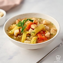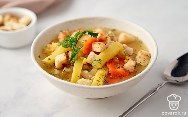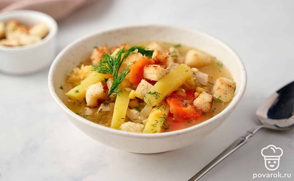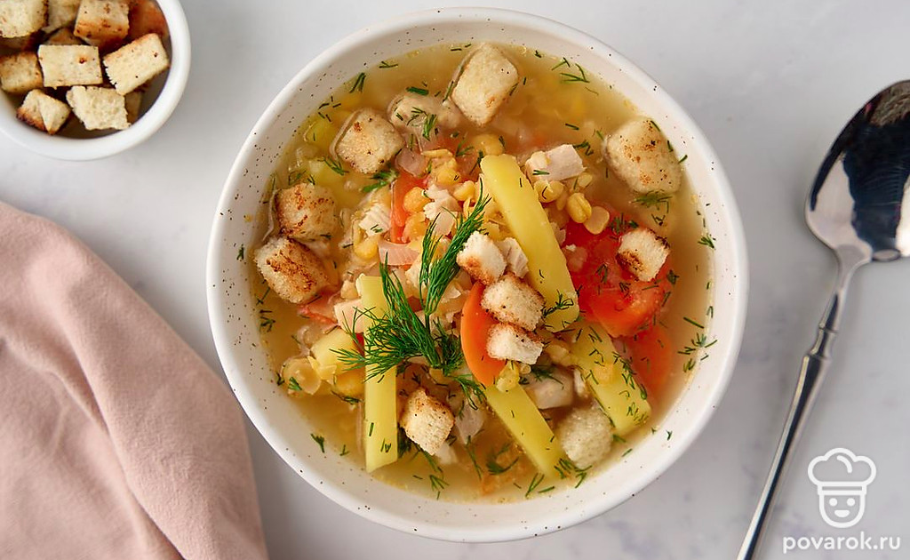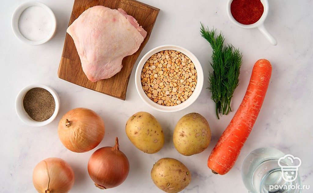 Чтобы приготовить вкусный гороховый суп на курином бульоне, совсем не обязательно предварительно замачивать бобы. При этом важно взять для блюда колотый горох, а не цельный. Что касается мяса, то подойдет любая часть курицы. Но лучше всего куриная спинка или бедрышки. С ними суп получится более наваристым. А интересные пикантные нотки блюду придадут специи.