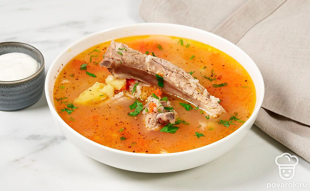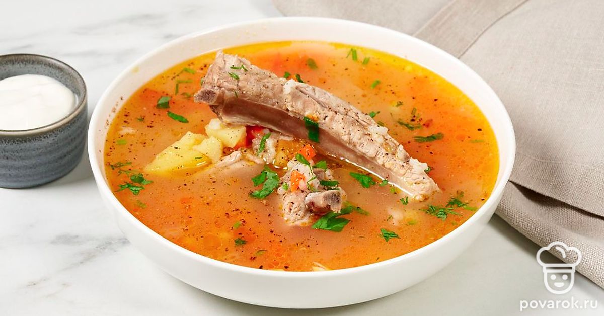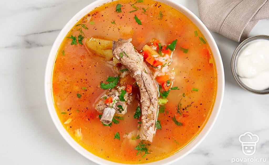 На бульоне из свиных ребрышек можно приготовить вкусный и наваристый суп. А еще в нем есть рис, поэтому блюдо получается очень сытным. Крупу лучше взять среднезерного или круглозерного сорта. Именно такой рис хорошо разваривается. Такой суп точно согреет холодными зимними вечерами.