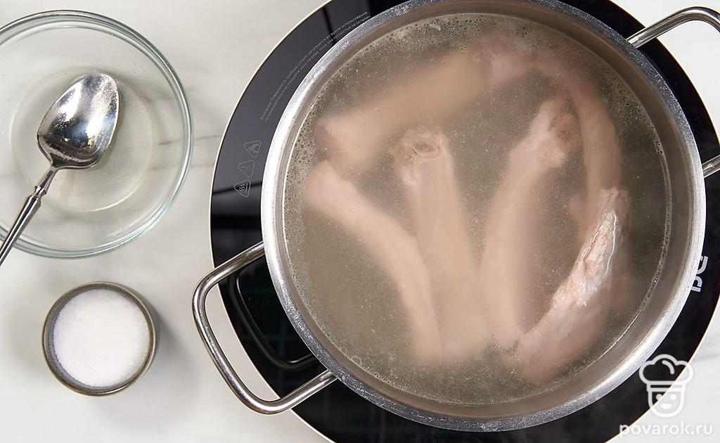 Нарежьте свиные ребра на порции, выложите их в кастрюлю. Залейте мясо водой и поставьте на огонь. Как только бульон закипит, снимите пенку и посолите его по вкусу. Варите ребра до готовности еще около получаса.