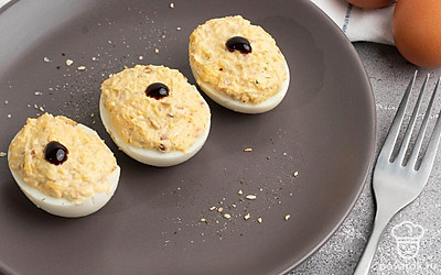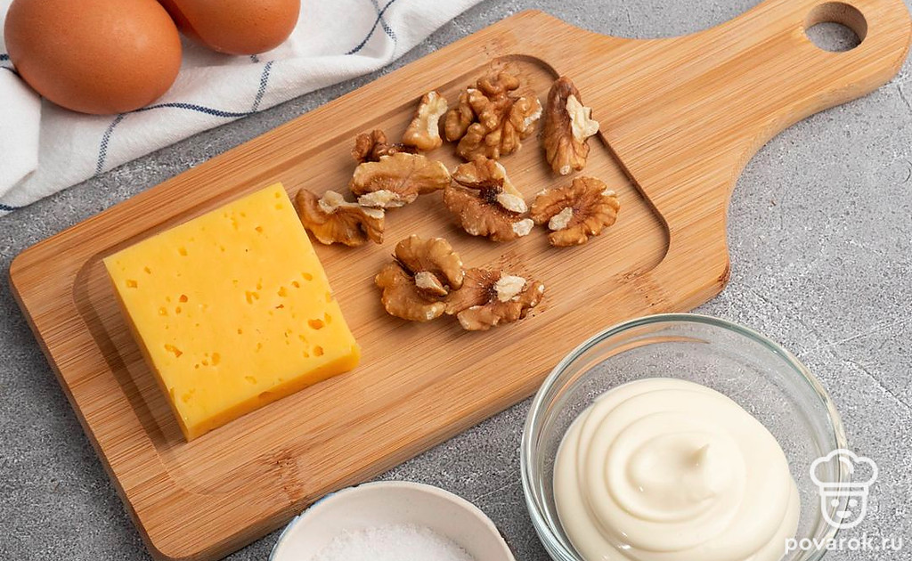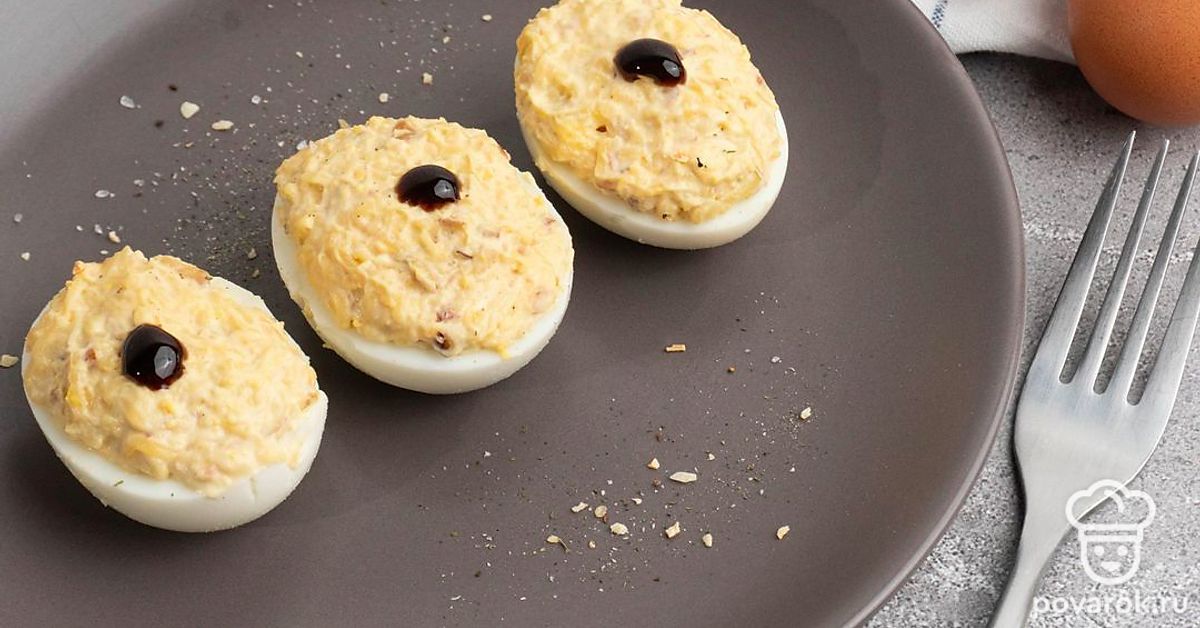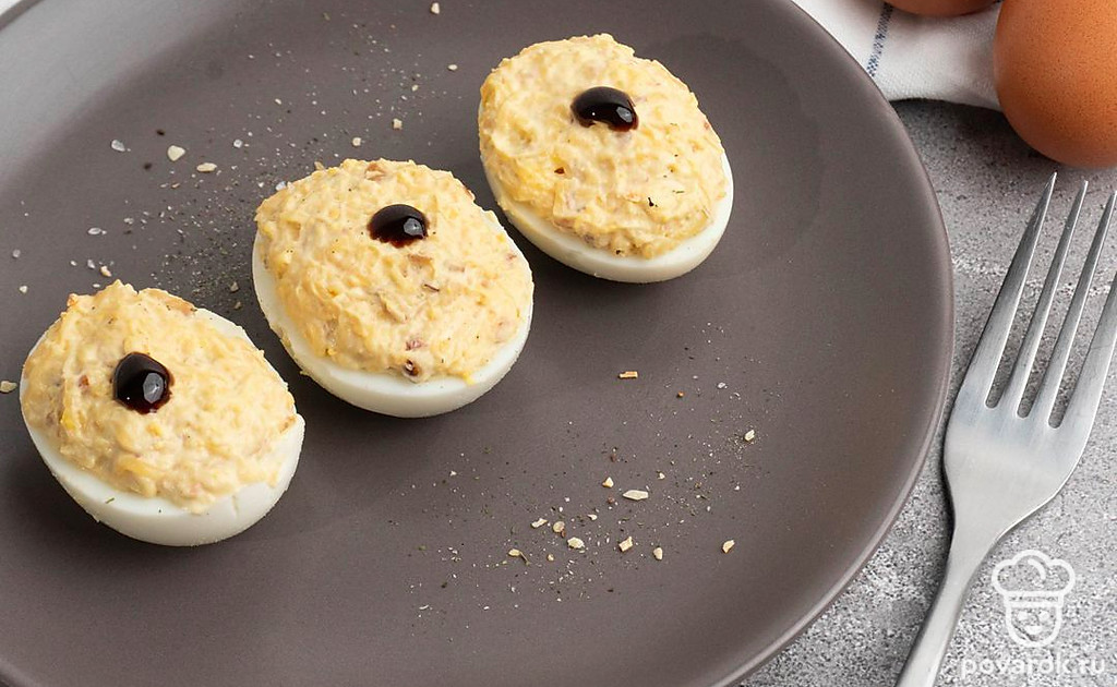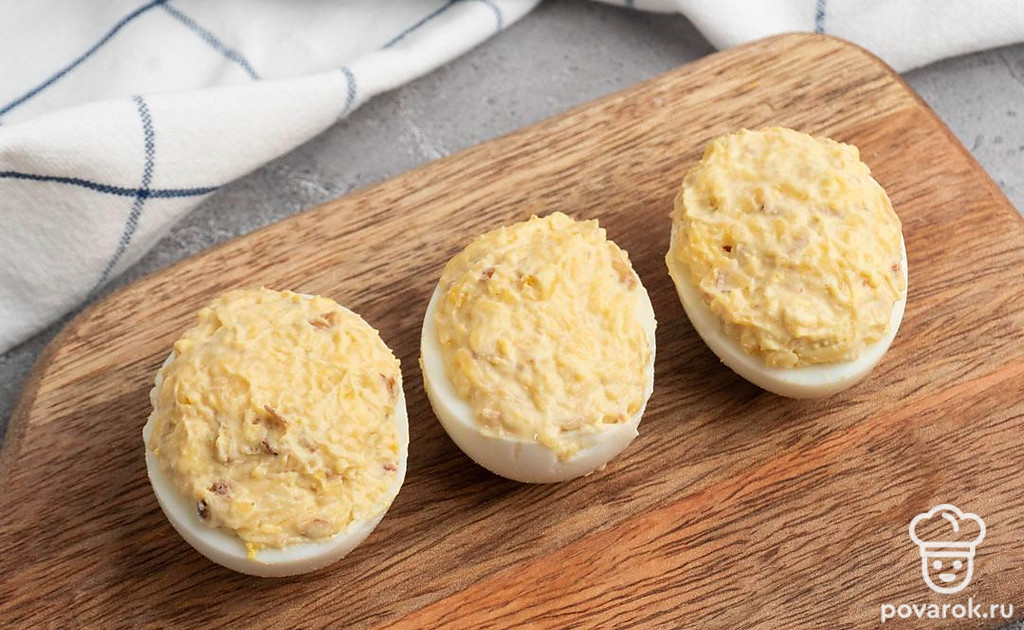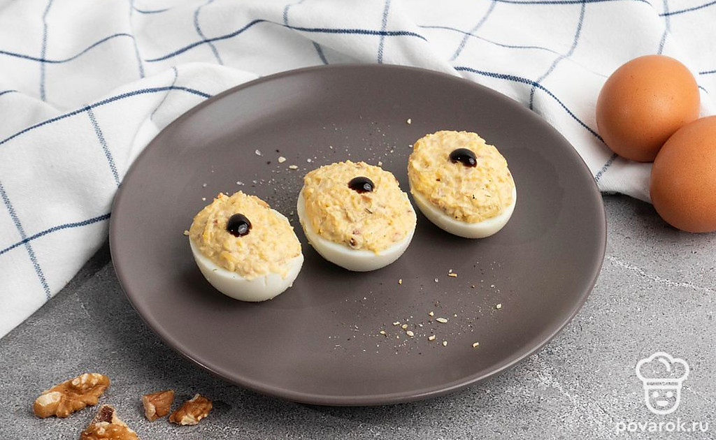 Тем, кто предпочитает хрустящие ореховые начинки в фаршированных яйцах наверняка понравиться наш рецепт. Грецкие орехи, мягкий майонез и яичный желток — это креативно и вкусно! Многие гости будут рады ее попробовать. Грецкий орех — считается настоящим ореховым королем, он пользуется наибольшей популярностью при начинках в кулинарии. Он помогает утолять город быстро, без переедания и стимулирует работу мозга.