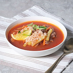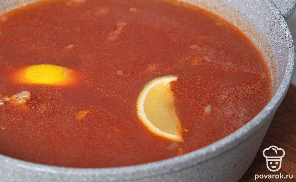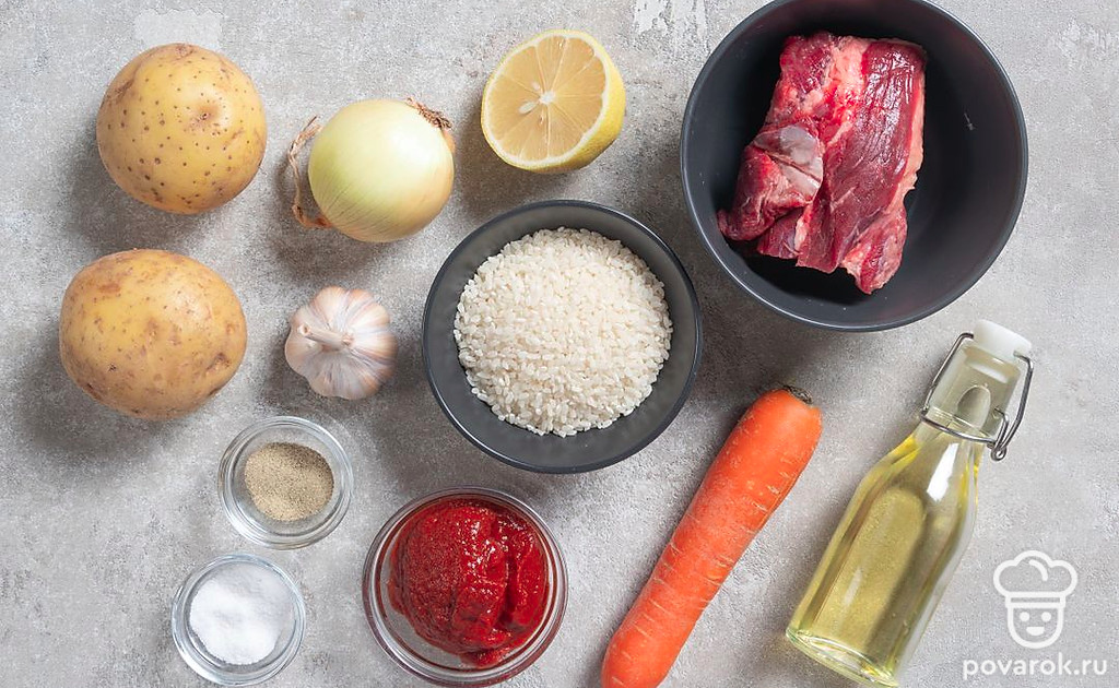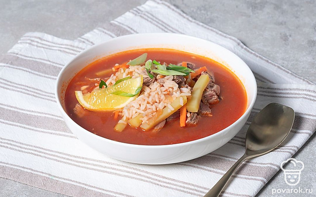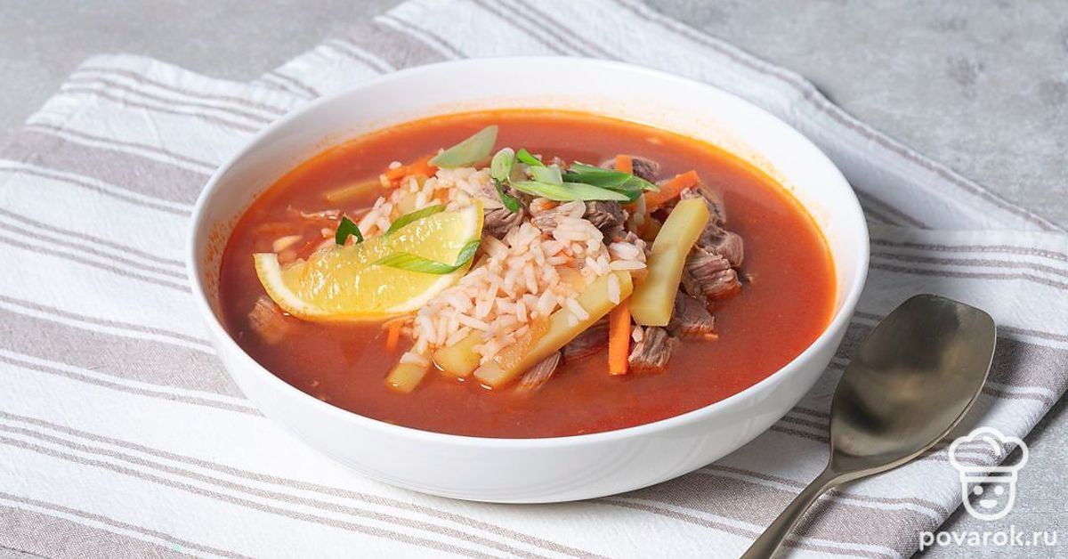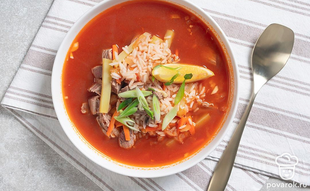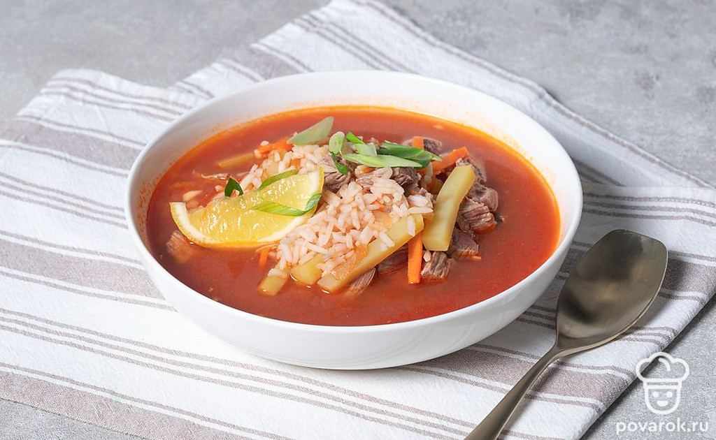 Для этого супа понадобится не только рис, но и много овощей: картошка, репчатый лук, морковь и чеснок. Бульон получается вкусный, наваристый, с приятной кислинкой — ее дает густая томатная паста. Но при желании вы можете заменить ее свежими помидорами. А чтобы усилить кислоту, обязательно подайте суп с долькой сочного лимона.