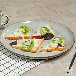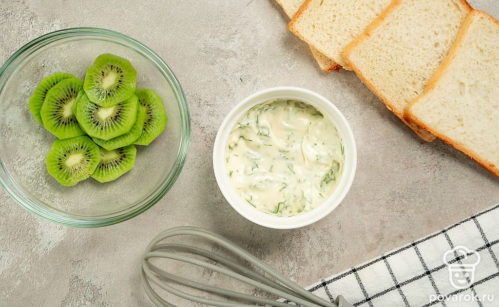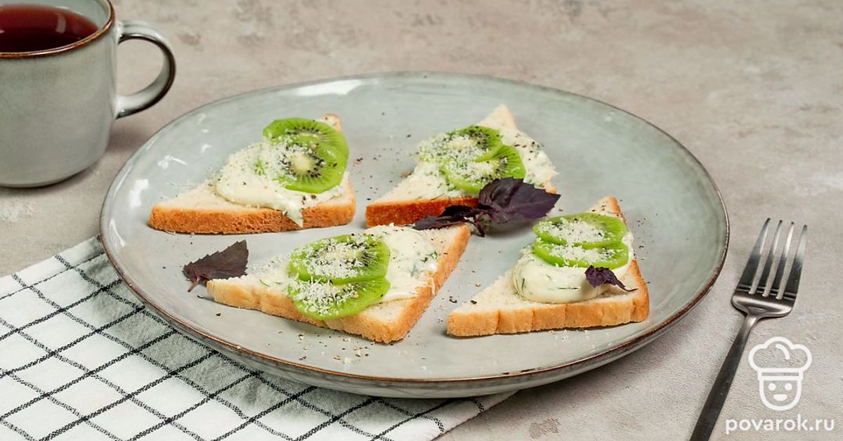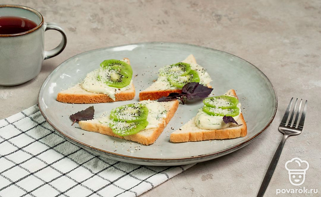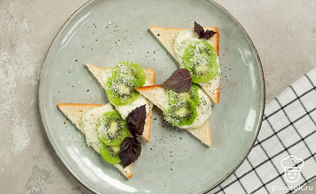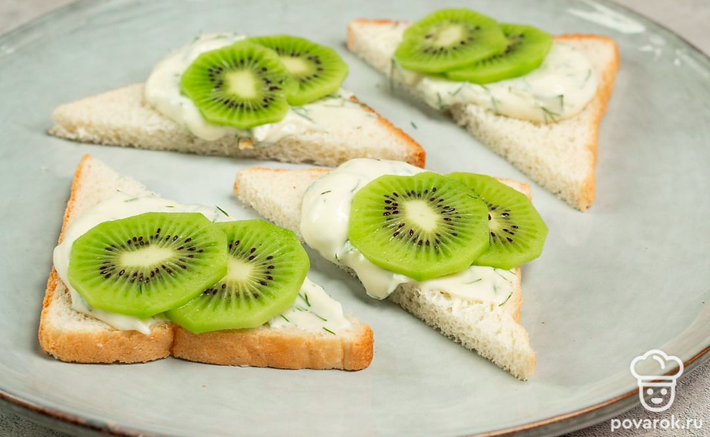 Киви — достаточно молодая ягода, появилась в середине XX века благодаря стараниям Александра Эллисона, садовода-любителя из Новой Зеландии. Назвал он его так за внешнее сходство с одноименной птичкой. Тосты с киви — это вкусно и полезно. Киви благотворно воздействует на пищеварение и состояние кожи. Благодаря содержащимся в нем витаминам, оно помогает заживлять раны и омолаживает организм. Плоды для бутерброда берите спелые, с жесткими, но легко ломающимися волосками.