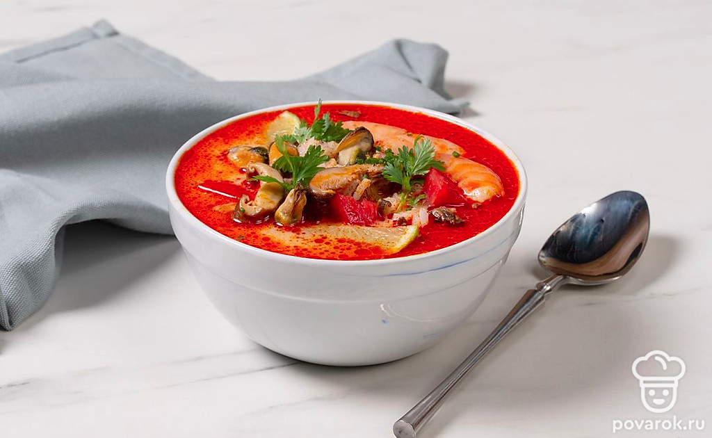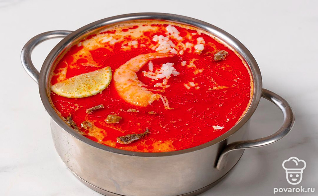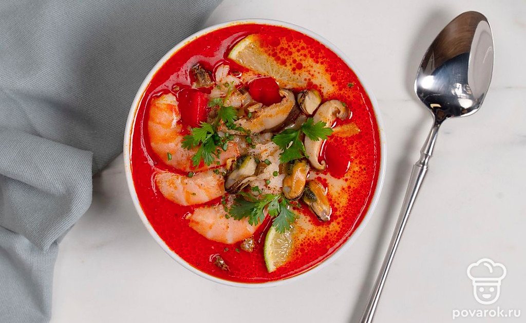 Вкус знаменитого тайского супа Том Ям редко кто берется точно описать. Он и острый, и сладкий, и кисловатый, и освежающий. Все это супу обеспечивает уникальная заправка на основе лемонграсса, имбиря, чеснока, рыбного соуса и других приправ. В наши дни сварить Том Ям можно без огромного количества ингредиентов с помощью уже готовой пасты для супа. Этот вариант супа с морепродуктами и грибами делает особенно наваристым бульон из голов креветок.
