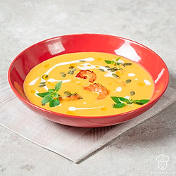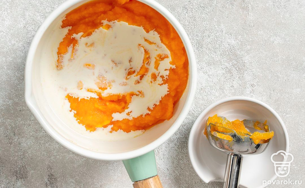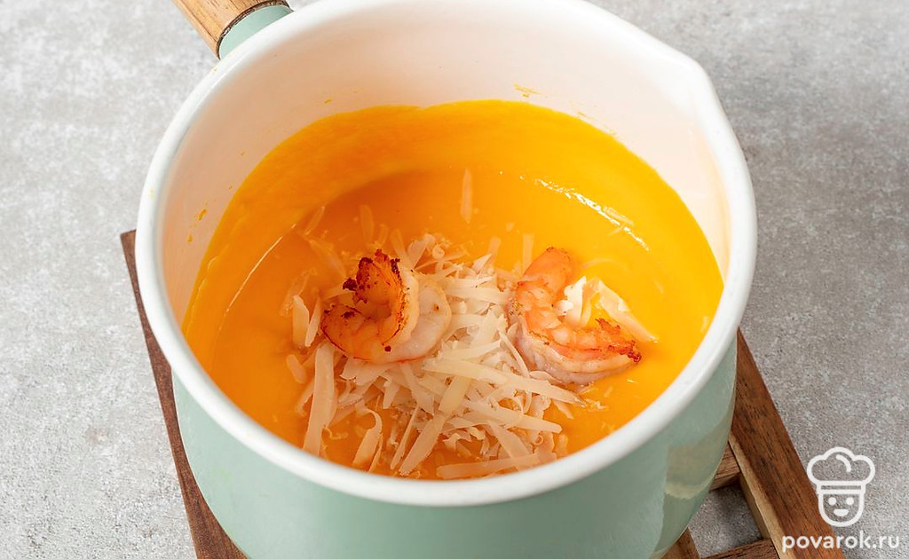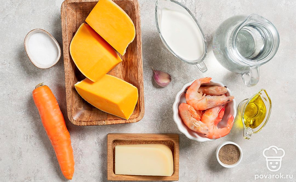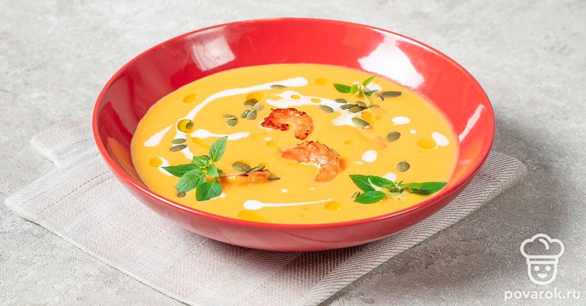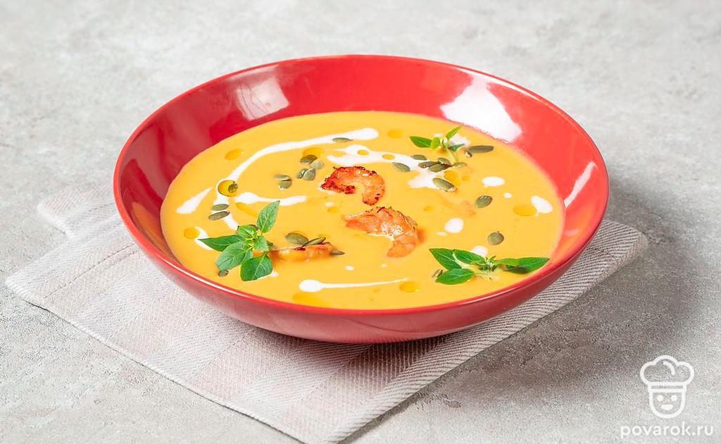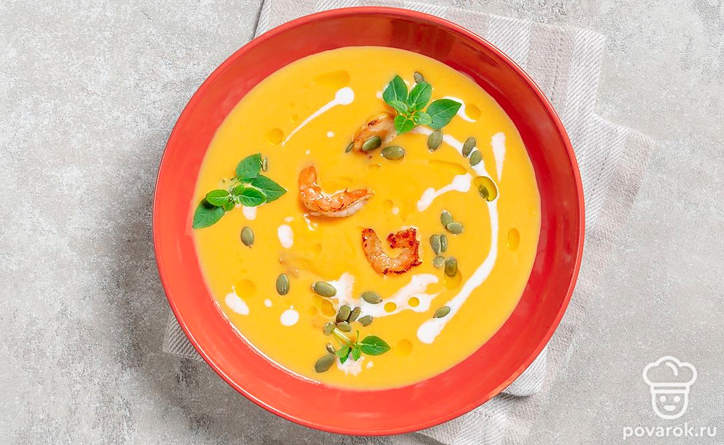 Тыква подходит для приготовления различных блюд, это могут быть закуски, основные блюда или десерты. Мы решили приготовить тыквенный крем-суп с креветками. Морепродукты хорошо дополняют сладковатый вкус тыквы, и суп получается очень аппетитным. Для более мягкой текстуры добавьте в суп сливки, они могут быть любой жирности. Самое главное, чтобы в них не было добавок, тогда тыквенный суп получится более натуральным.