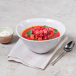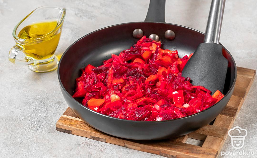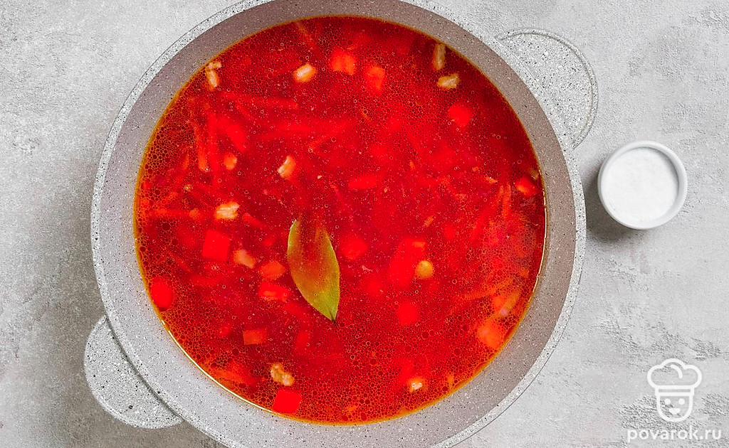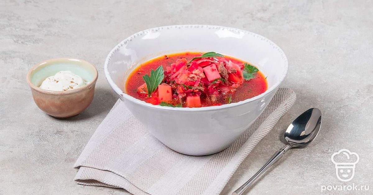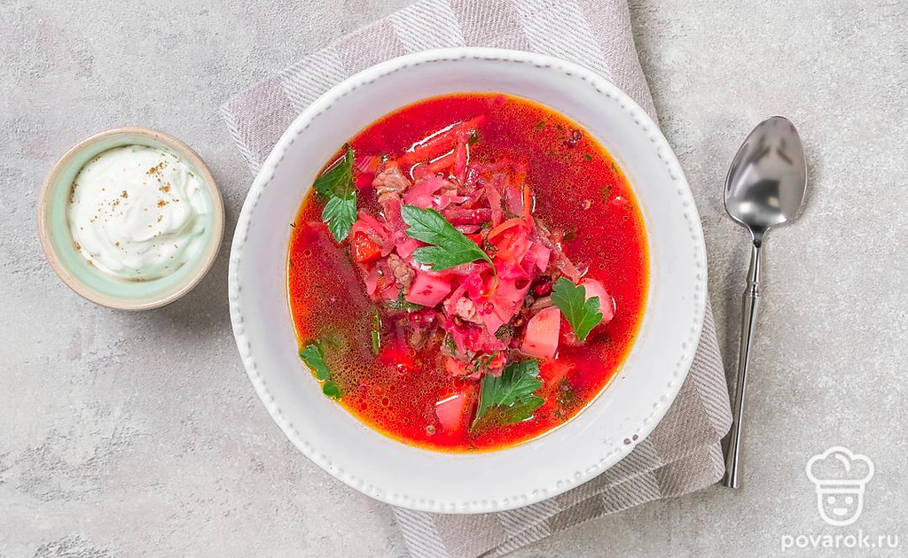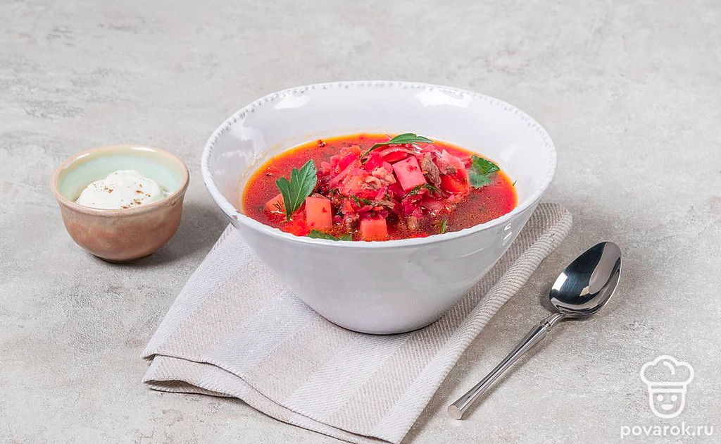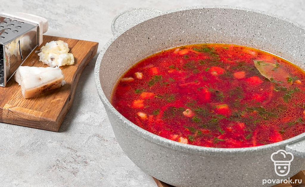 Чтобы суп получился насыщенного ярко-красного цвета, в первую очередь нужно обжарить свеклу на растительном масле и только потом добавлять в зажарку остальные ингредиенты. Сало, натертое на терке и смешанное с измельченным чесноком, придаст готовому блюду пикантность и невероятно аппетитный аромат. Обязательно подавайте борщ со сметаной и кусочком бородинского хлеба.