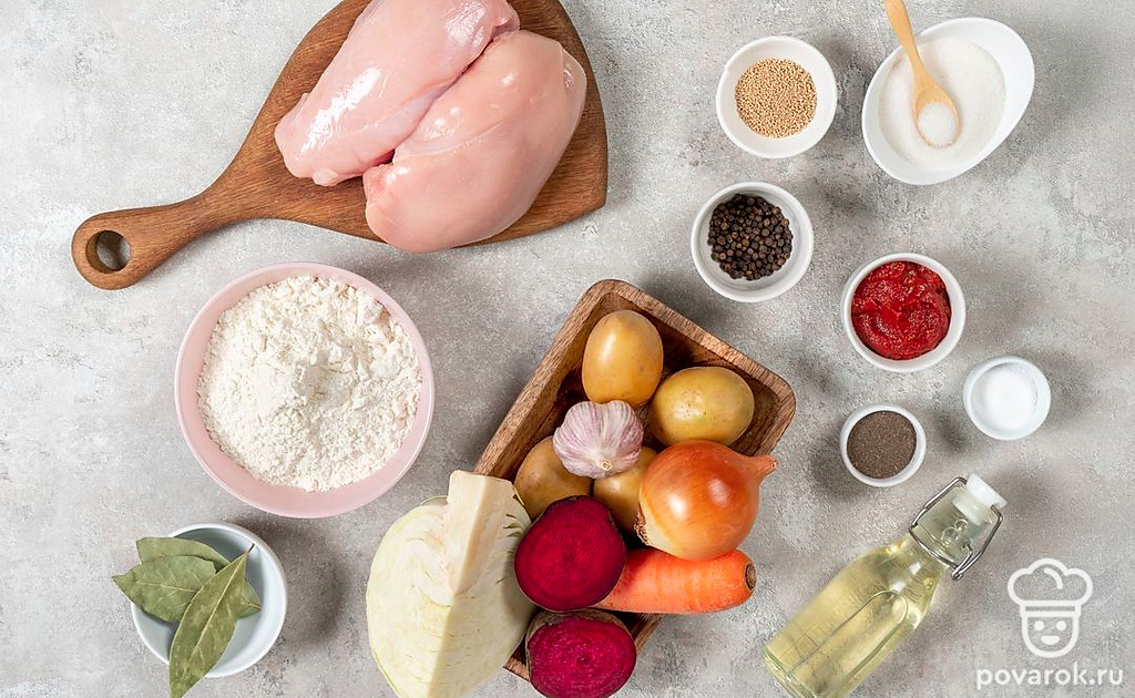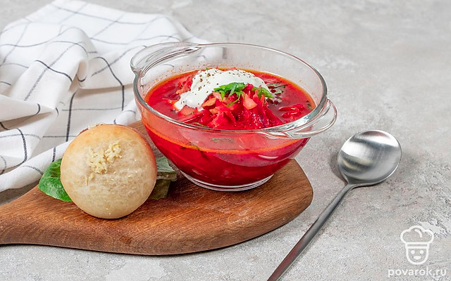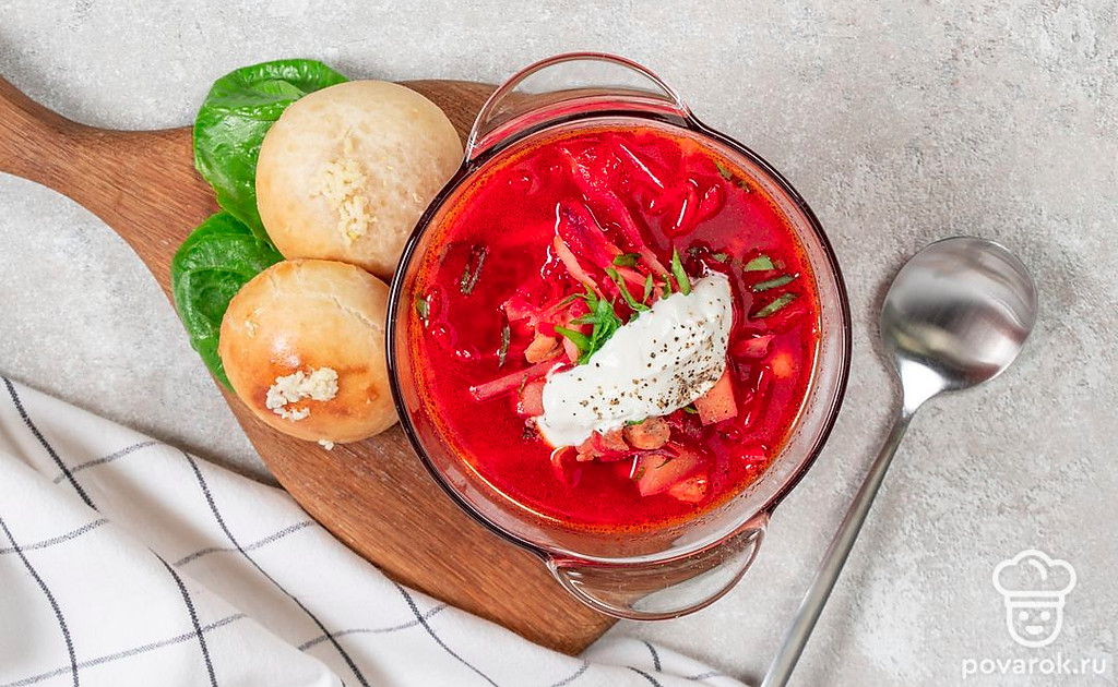 Борщ — традиционное блюдо русской, украинской и белорусской кухни. Причем в каждой стране его делают по-своему, изменяя состав и технику приготовления. Чтобы суп получился наваристым, в него добавляют мясо. В этом рецепте используется курица, но вы можете взять баранину или говядину. Дополнить борщ и сделать его еще вкуснее помогают пампушки из дрожжевого теста — воздушные булочки с чесночным ароматом.