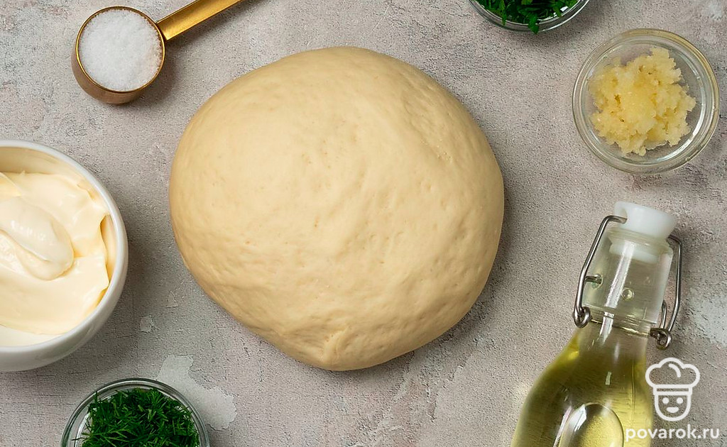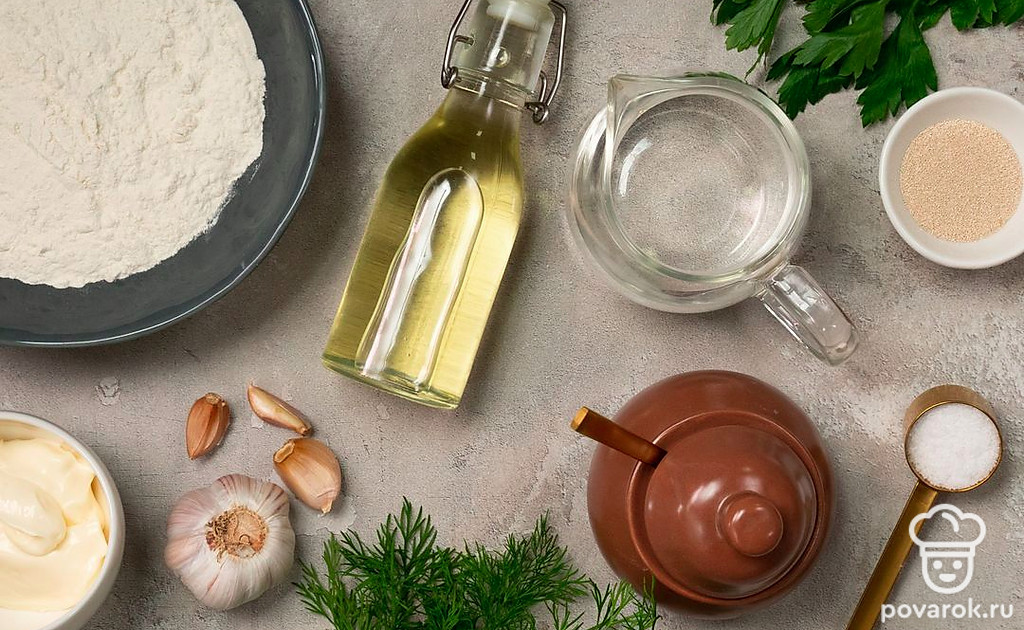 Муку просейте через мелкое сито. Воду слегка подогрейте до температуры выше комнатной. Чеснок очистите и выдавите в прессе. Петрушку и укроп помойте, просушите и мелко нарежьте, оставив листочки с одной веточки петрушки для украшения. Застелите противень пергаментом.