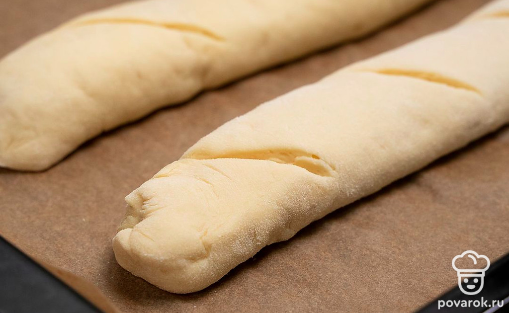 Сформируйте багет. Раскатайте готовое тесто в прямоугольный пласт толщиной 3-5 мм. Сверните пласт теста в рулет, закрепите края. На противень выложите багет швом вниз, разметьте ножом места поперечных надрезов и оставьте багет для расстойки в теплом месте на 20 минут. Выпекайте багет в духовке при 180 градусах в течение 20 минут.