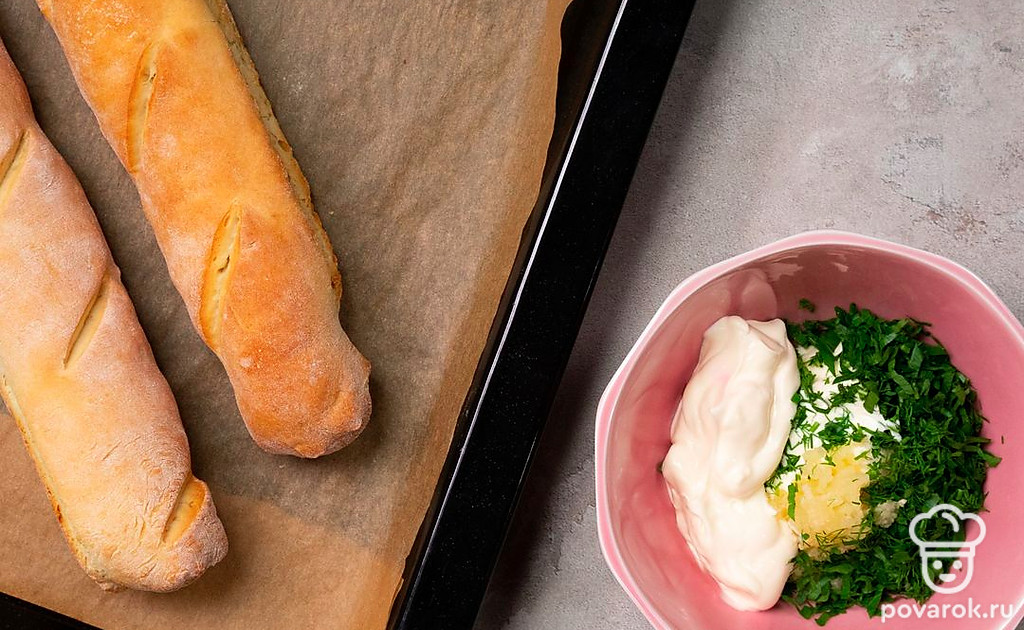 Сделайте соус и добавьте его в багет. В миске соедините майонез, чеснок и нарезанную зелень петрушки и укропа, тщательно перемешайте. Достаньте багет из духовки, сделайте на нем поперечные надрезы в ранее помеченных местах и с помощью силиконовой кисточки распределите по ним соус. Пеките багет еще 10 минут, затем достаньте из духовки и слегка остудите перед подачей.