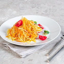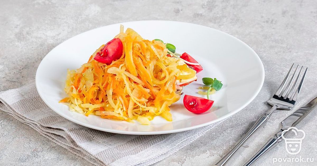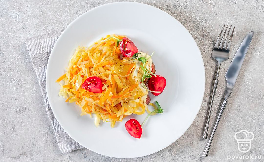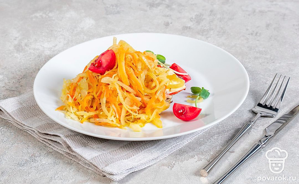 Отличное низкокалорийное блюдо, которое можно подать в качестве гарнира. Одинаково хорошо эта капуста будет сочетаться как с мясом, так и с рыбой. При желании можно добавить в конце приготовления немного томатной пасты. В этом случае блюдо получит более насыщенный вкус с легкой кислинкой.