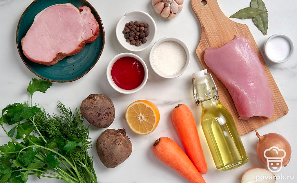 Ароматный борщ из индейки и копченой свинины — это невероятно сытное блюдо на обед и ужин. Копченая свинина добавляет яркую изюминку супу, а индейка придает солоноватый привкус и мягкость. Одного "правильного" рецепта борща, как известно, не существует. Кто-то считает, что его нужно готовить с курицей, кто-то — с салом, а кто-то стремится добавить в борщ рыбу, грибы или фасоль. Поэтому и в этом рецепте можно экспериментировать с ингредиентами по своему вкусу.