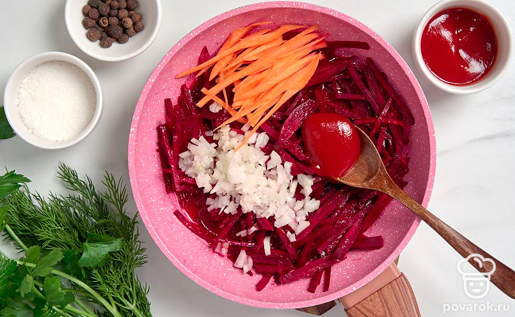 Приготовьте поджарку. Половину запеченной свеклы натрите на терке. Выложите ее на сковороду, добавьте растительное масло и обжарьте свеклу течение 5 минут на среднем огне. Затем добавьте томатную пасту, соль, половину лимонного сока и сахара. Перемешайте и тушите 7 минут. Добавьте к свекле лук и морковь, обжаривайте в течение 10 минут. Оставшуюся свеклу измельчите в блендере до состояния пюре.