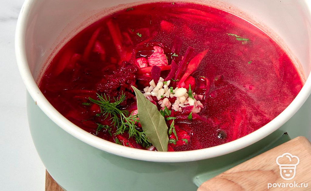 Сварите борщ. В кастрюлю налейте воду. Положите лавровый лист, перец и листья петрушки. Варите 5 минут. Добавьте индейку и свинину, варите 20 минут. Затем выложите свекольную поджарку и варите еще 10 минут. Добавьте соль по вкусу, оставшийся сахар и лимонный сок, пюре из свеклы, веточки укропа и чеснок. Тщательно перемешайте и варите 15 минут.