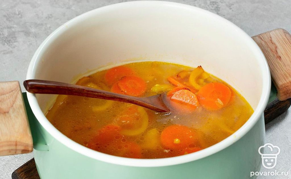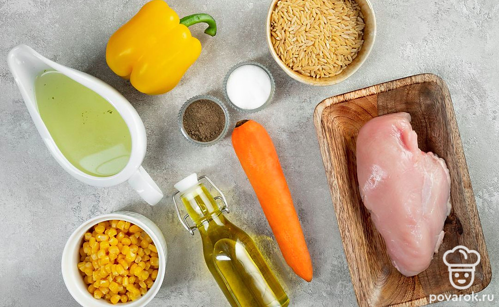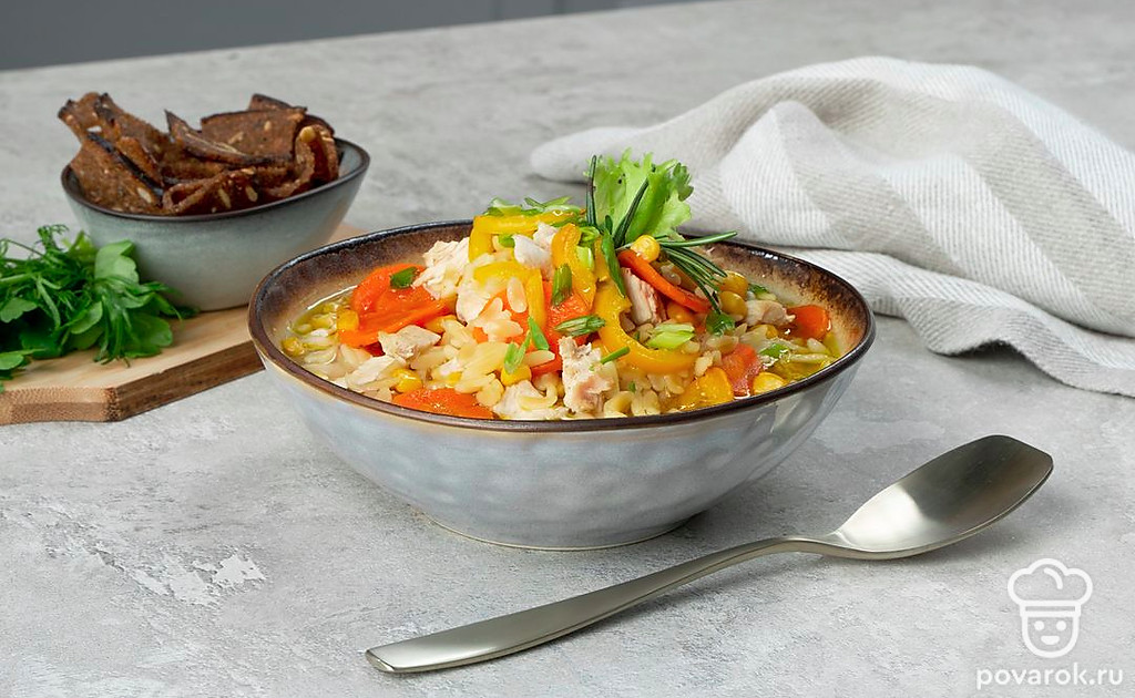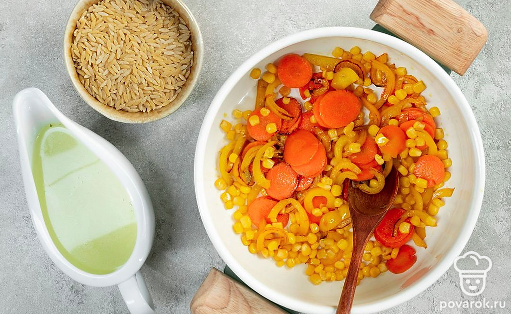 Приготовьте зажарку. Разогрейте в кастрюле масло и немного обжарьте морковь. Добавьте болгарский перец и кукурузу. Подержите их на огне несколько минут и всыпьте пасту орзо.