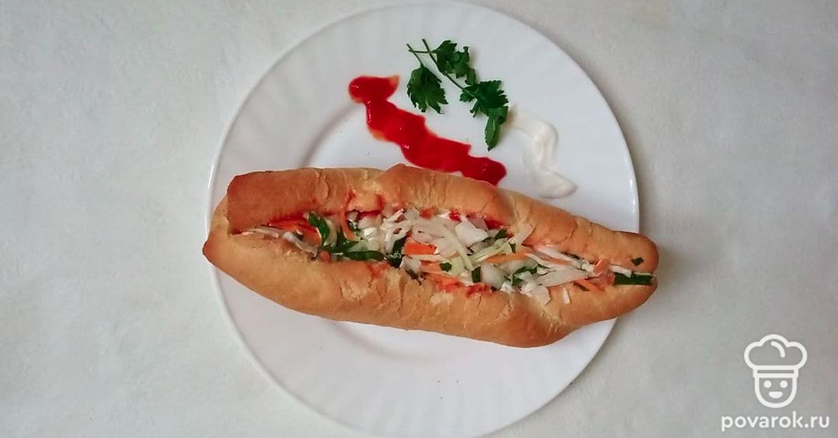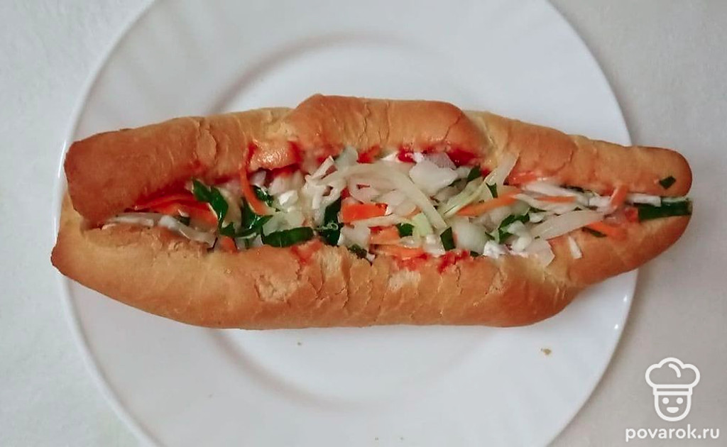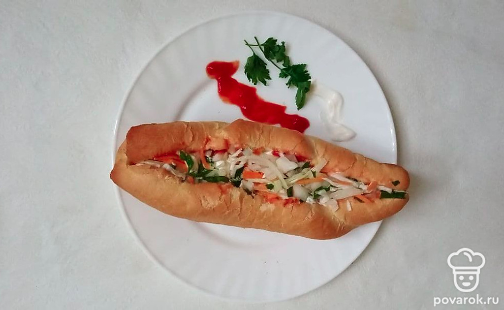 Смешайте все ингредиенты для салата: капусту, морковь, лук. Добавьте соль по вкусу. Все тщательно перемешайте. Хот-дог достаньте с микроволновки. Полейте кетчупом, майонезом и сверху выложите салат.
