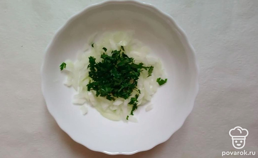 С лука слейте лишний уксус. Добавьте мелко нарезанную петрушку. Морковь нарежьте тонкими ломтиками. Сыр натрите на мелкой терке.