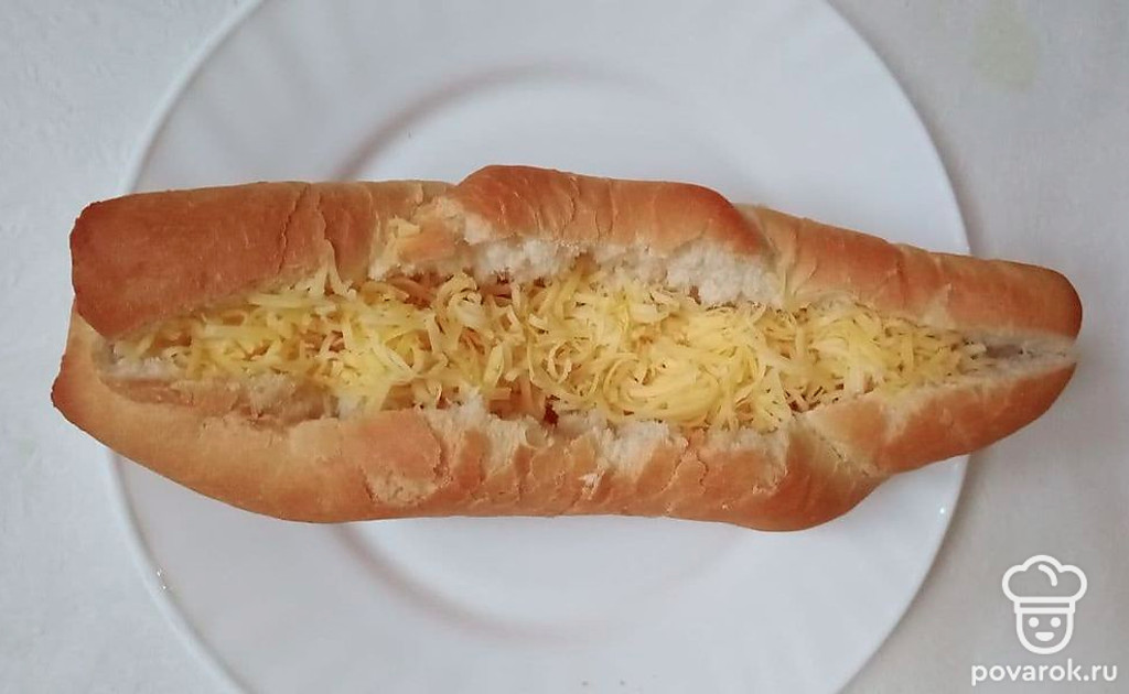 Булку для хот-дога разрежьте вдоль, не до конца. Положите в нее сосиску, предварительно снимите с нее шкуру. Сверху посыпьте сыром. Поставьте в микроволновку на 1-2 минуты, чтобы сыр расплавился и булка немного нагрелась.