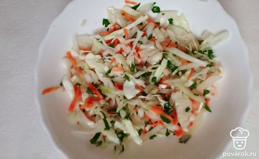Лук нарежьте тонкими полосками. Залейте горячей водой, дайте немного постоять, около 2 минут. Затем воду слейте и добавьте в лук 2 ч.л. уксуса. Капусту нарежьте тонкими полосками.