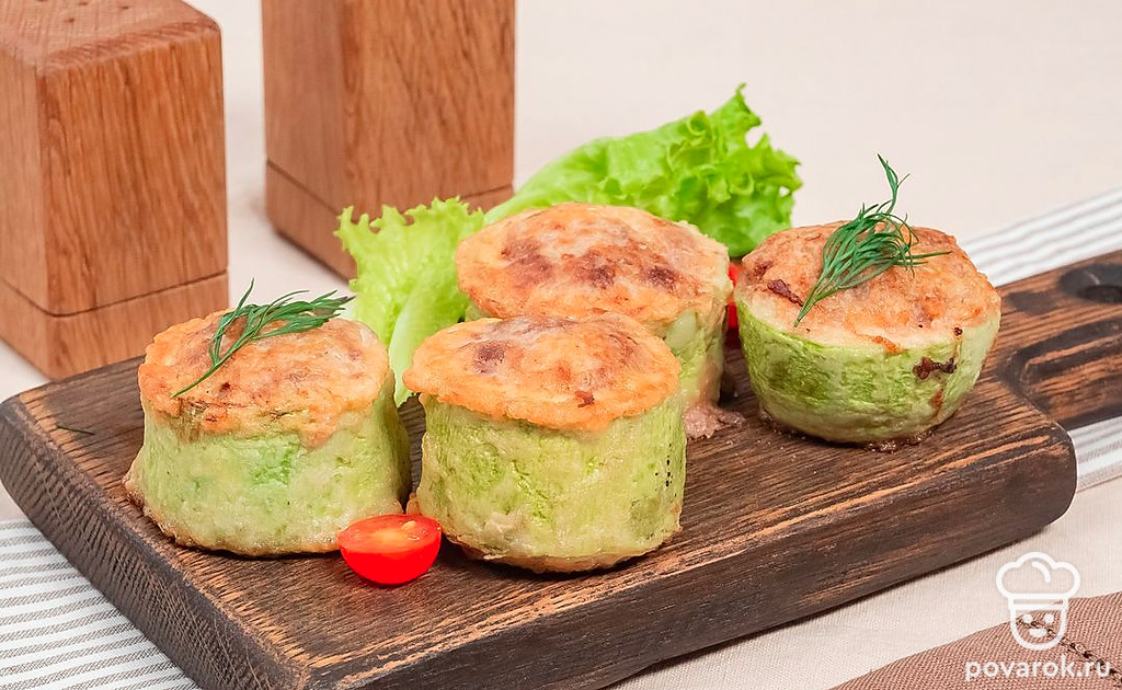 Закуску из фаршированных кабачков лучше подавать к столу теплой, пока не остыл расплавленный в начинке сыр. Для эффектной подачи выложите кабачки на деревянный поднос, предварительно украшенный листьями салата латук и маленькими сочными помидорами черри.