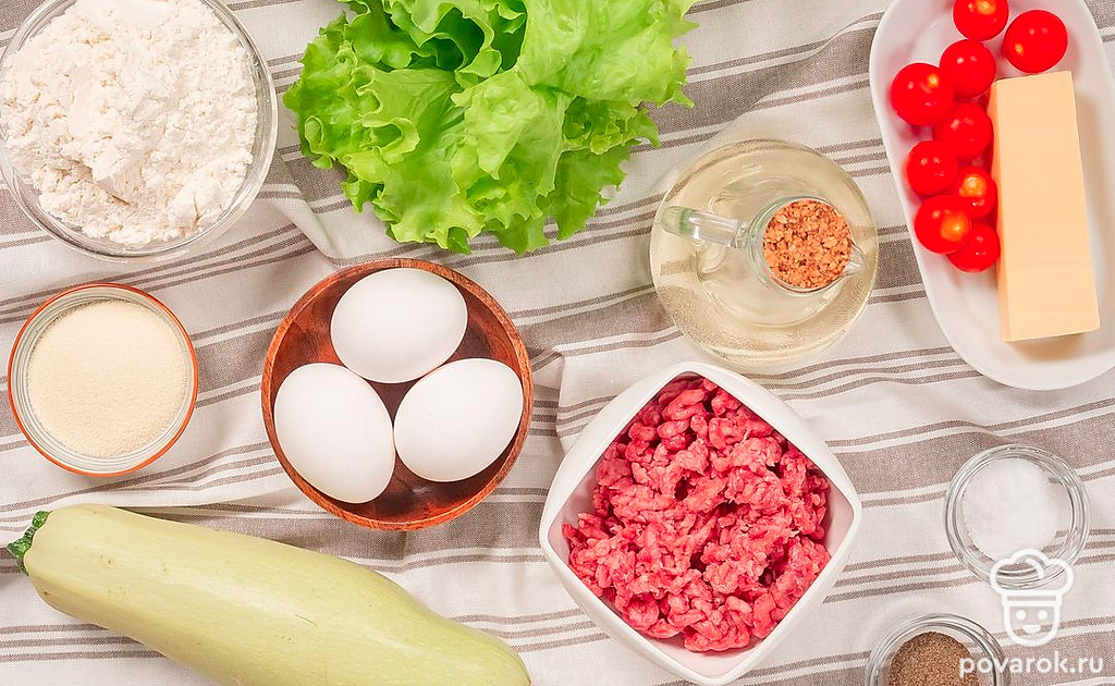 Для приготовления фаршированных кабачков с фаршем на сковороде заранее вымойте и обсушите на чистом полотенце овощи. Не забудьте тщательно вымыть куриные яйца, даже если на них нет видимых загрязнений. Это можно сделать с помощью теплой проточной воды и обычной пищевой соды. Салат латук и помидоры черри для подачи промойте и обсушите.