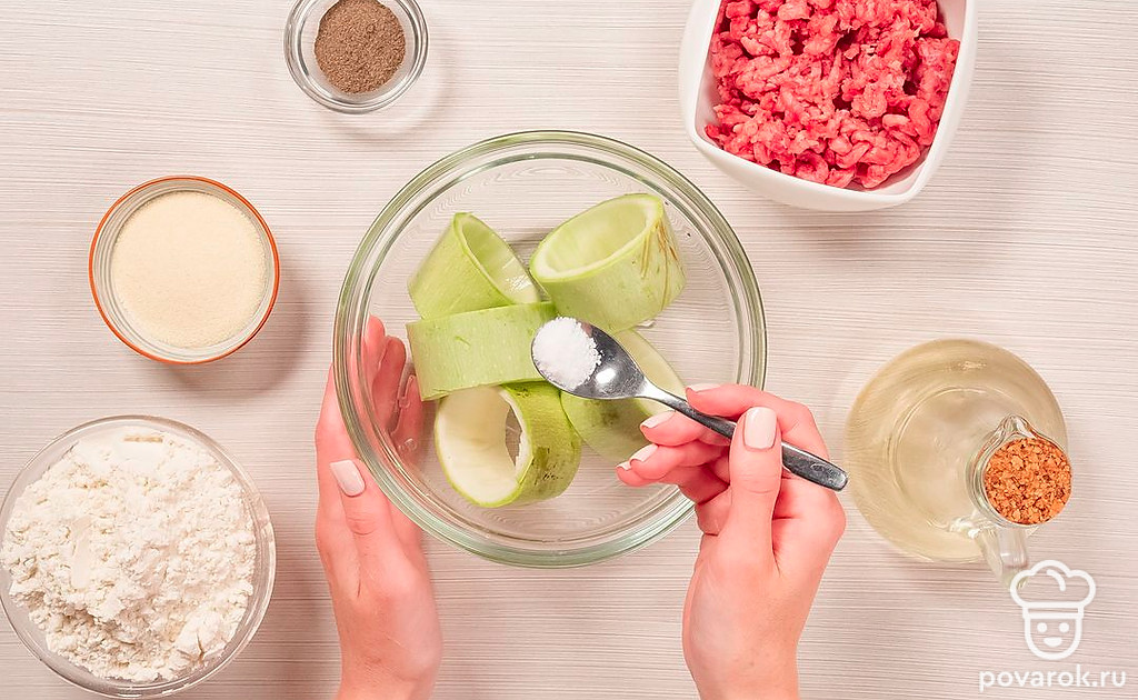 Подготовьте кабачки. Чистые кабачки нарежьте кружочками толщиной 1-1,5 см. С помощью ножа вырежьте из кружочков кабачков середину. Кабачковые кольца переложите в глубокую тарелку, засыпьте 0,5 ч. л. соли, перемешайте и оставьте на 10 минут, чтобы кабачки пустили сок.
