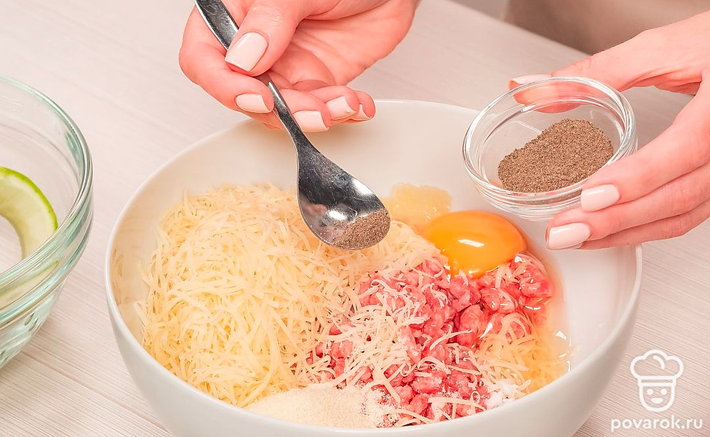 Приготовьте начинку. Натрите на мелкой терке или измельчите в блендере твердый сыр. В глубокой миске соедините фарш, сыр, 1 куриное яйцо, манку и 0,5 ч. л. соли. Добавьте черный молотый перец и перемешайте начинку.
