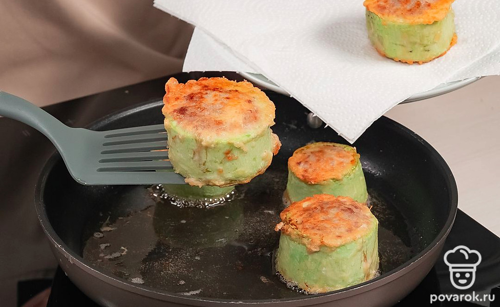 Обжарьте кабачки. Из кабачков слейте сок и обсушите кольца на бумажном полотенце. Каждое кольцо заполните фаршем, чтобы он не сильно выступал за края колечка. В миске взбейте 2 яйца. На сковороде разогрейте растительное масло. Каждое нафаршированное кольцо обваляйте в муке, затем обмакните в яйцах и выложите на сковороду. Обжаривайте кабачковые кольца по 7-10 минут с каждой стороны на медленном огне. Жареные фаршированные кабачки выложите на салфетку, чтобы убрать лишний жир.