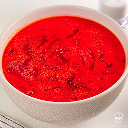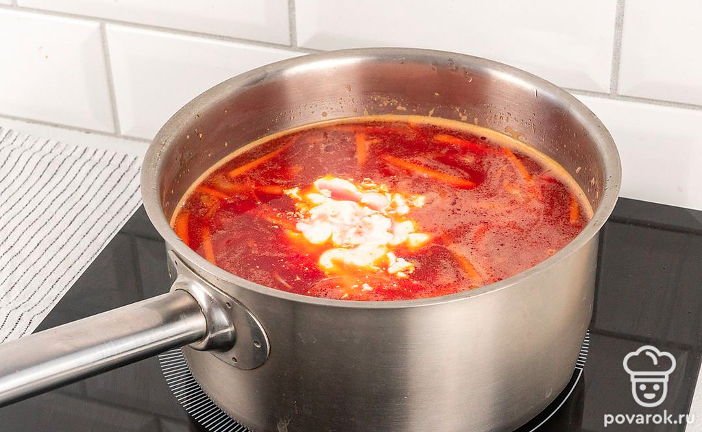 Когда картофель сварится, добавьте к нему лук с морковью и нарезанную свеклу. Добавьте соль и сахар по вкусу, а также столовую ложку сметаны. Перемешайте. Доведите свекольник до кипения и снимите с огня.