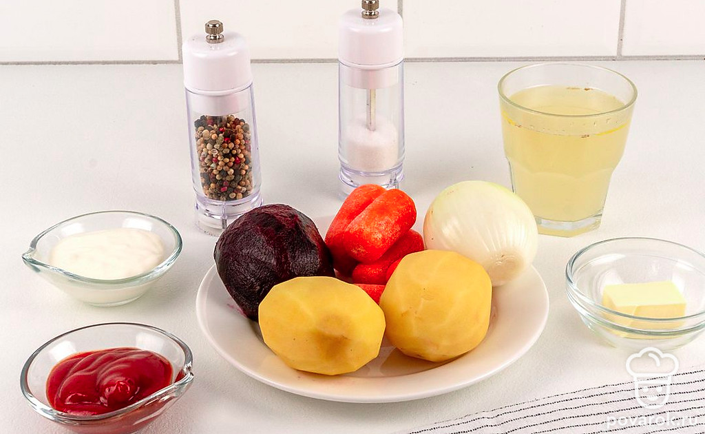 Свеклу для детского свекольника предварительно отварите до готовности и остудите. Очистите лук, морковь, картофель и вареную свеклу. Бульон для супа вы можете взять мясной, куриный или овощной либо заменить его простой водой.
