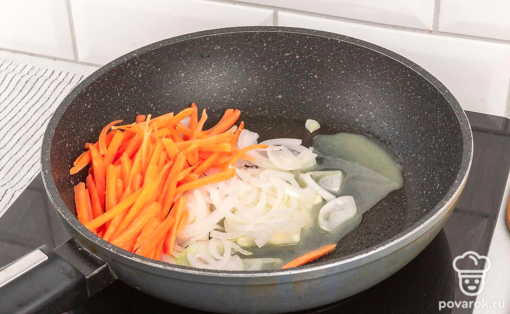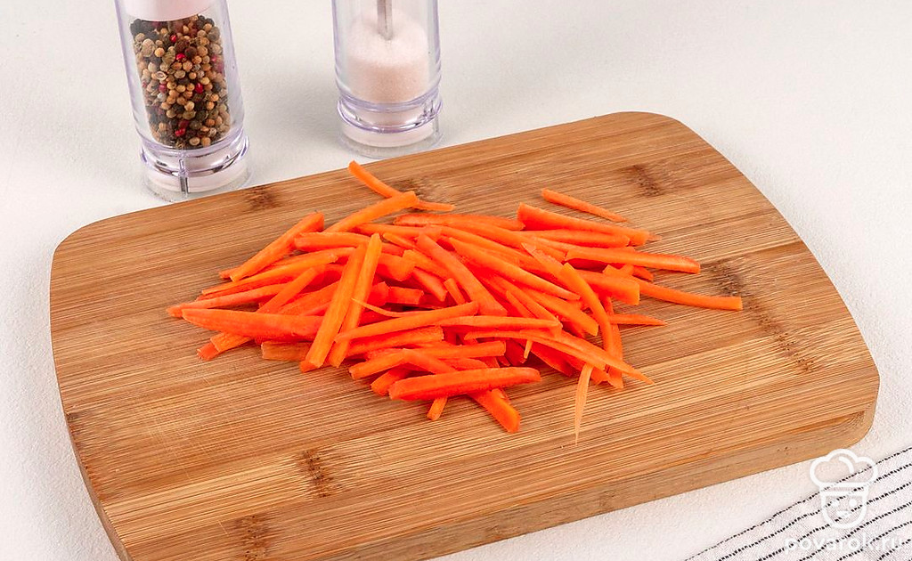 Морковь нарежьте тонкой соломкой либо натрите на крупной терке.