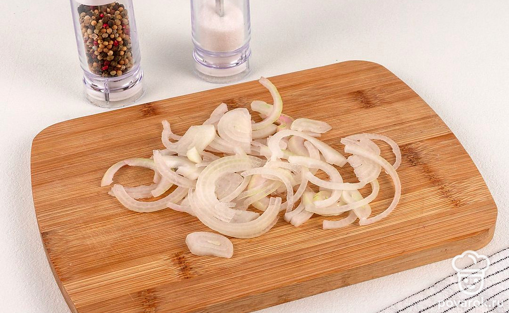 Репчатый лук нарежьте тонкими полукольцами.