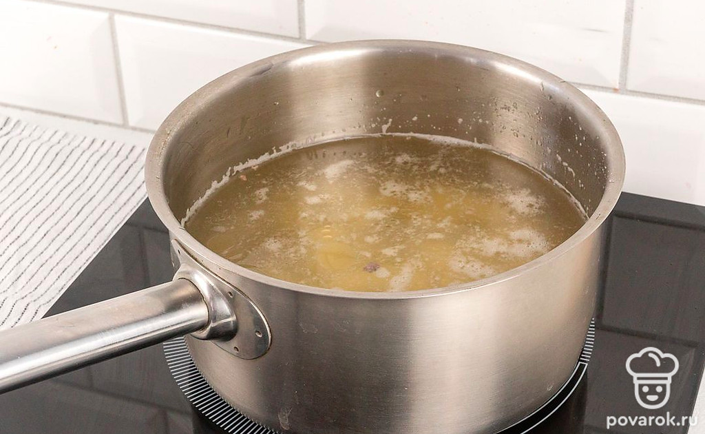 Доведите бульон до кипения и убавьте огонь. Отправьте картофель в бульон и варите до готовности, периодически снимая пенку.