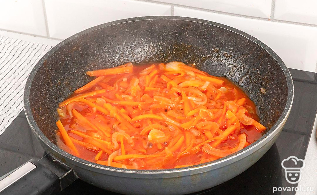 Добавьте к овощам столовую ложку кетчупа и влейте небольшой количество бульона. Все перемешайте и тушите на медленном огне до мягкости овощей.