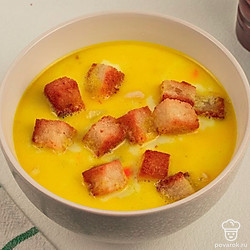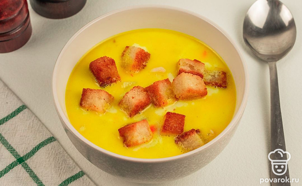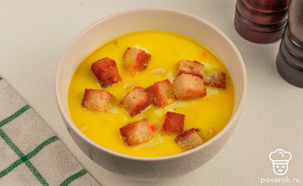 Суп является обязательным блюдом из рациона людей, которые следят за своей фигурой и здоровьем. Прекрасная альтернатива привычным супам — сырный суп с гренками. Бульон готовится на курином филе, однако для более наваристого блюда вы можете использовать мясо на кости. Подавайте сырный суп с гренками горячим!