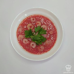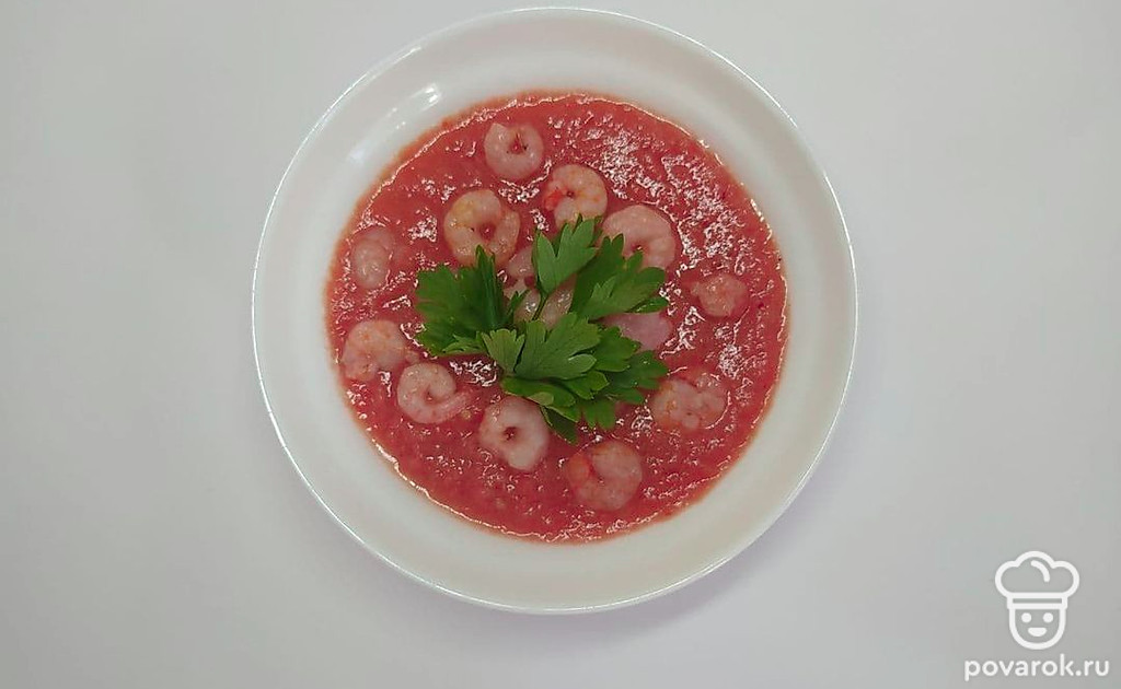 Подавайте готовое блюдо порционно. Положите в каждую тарелку креветки, налейте сверху суп. Также, чтобы подчеркнуть необычное послевкусие сельдерея, можно украсить гаспачо палочкой сельдерея и свежими травами. Также готовый суп можно сбрызнуть оливковым маслом.