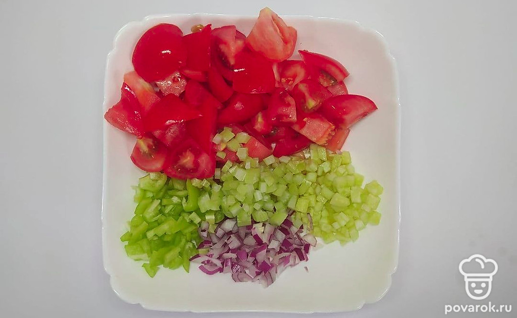 Нарежьте помидоры на крупные кубики, мелко нарежьте зеленый сладкий перец, лук и сельдерей. Измельчите чеснок. Очистите огурец от кожуры и также мелко нарежьте.