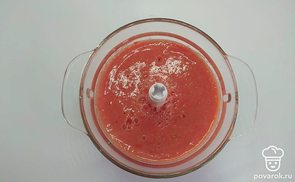 Поместите всю нарезку в чашу блендера и измельчайте не больше минуты, добавьте в получившуюся смесь томатный сок и уксус и снова взбивайте несколько секунд.